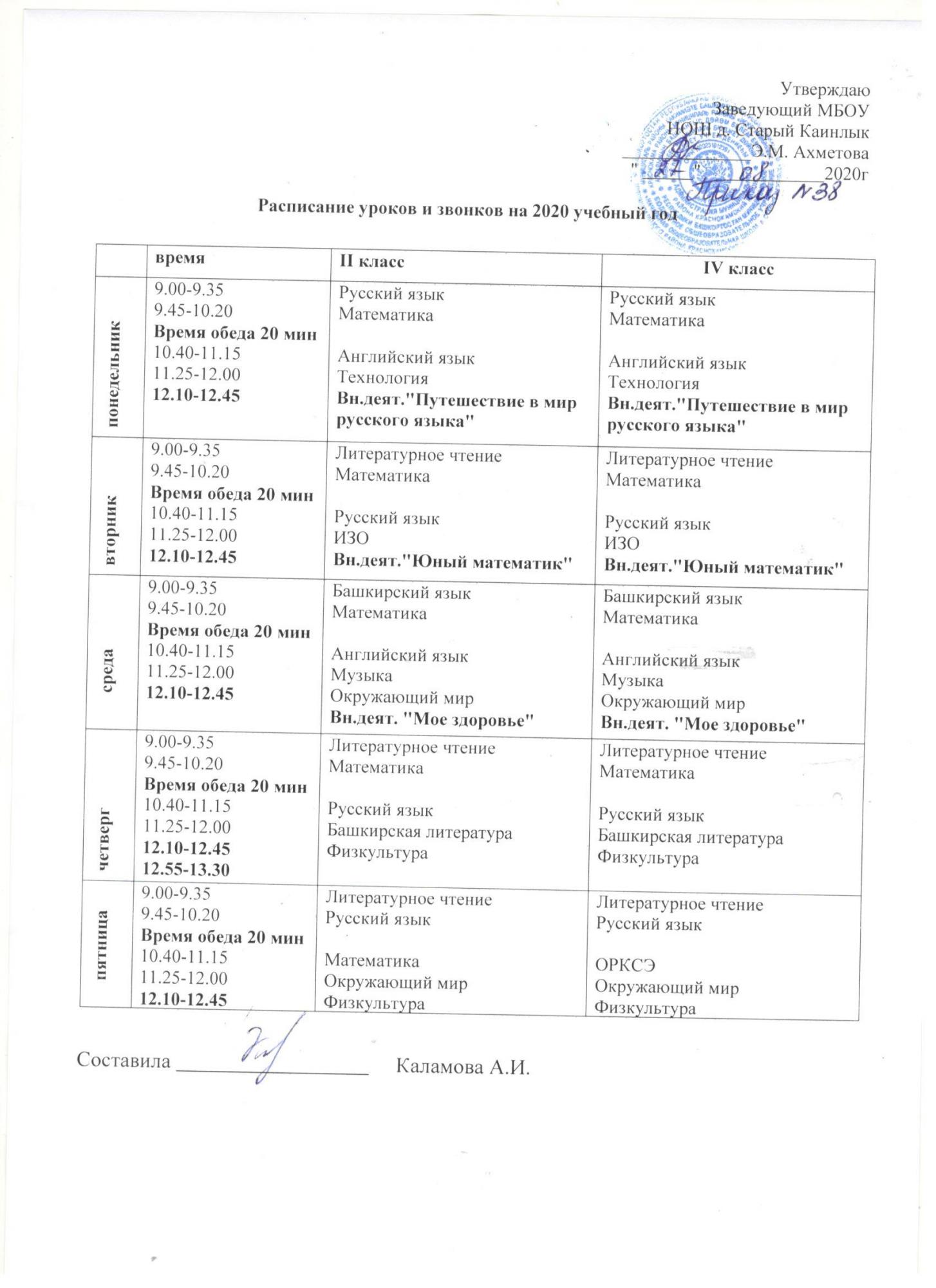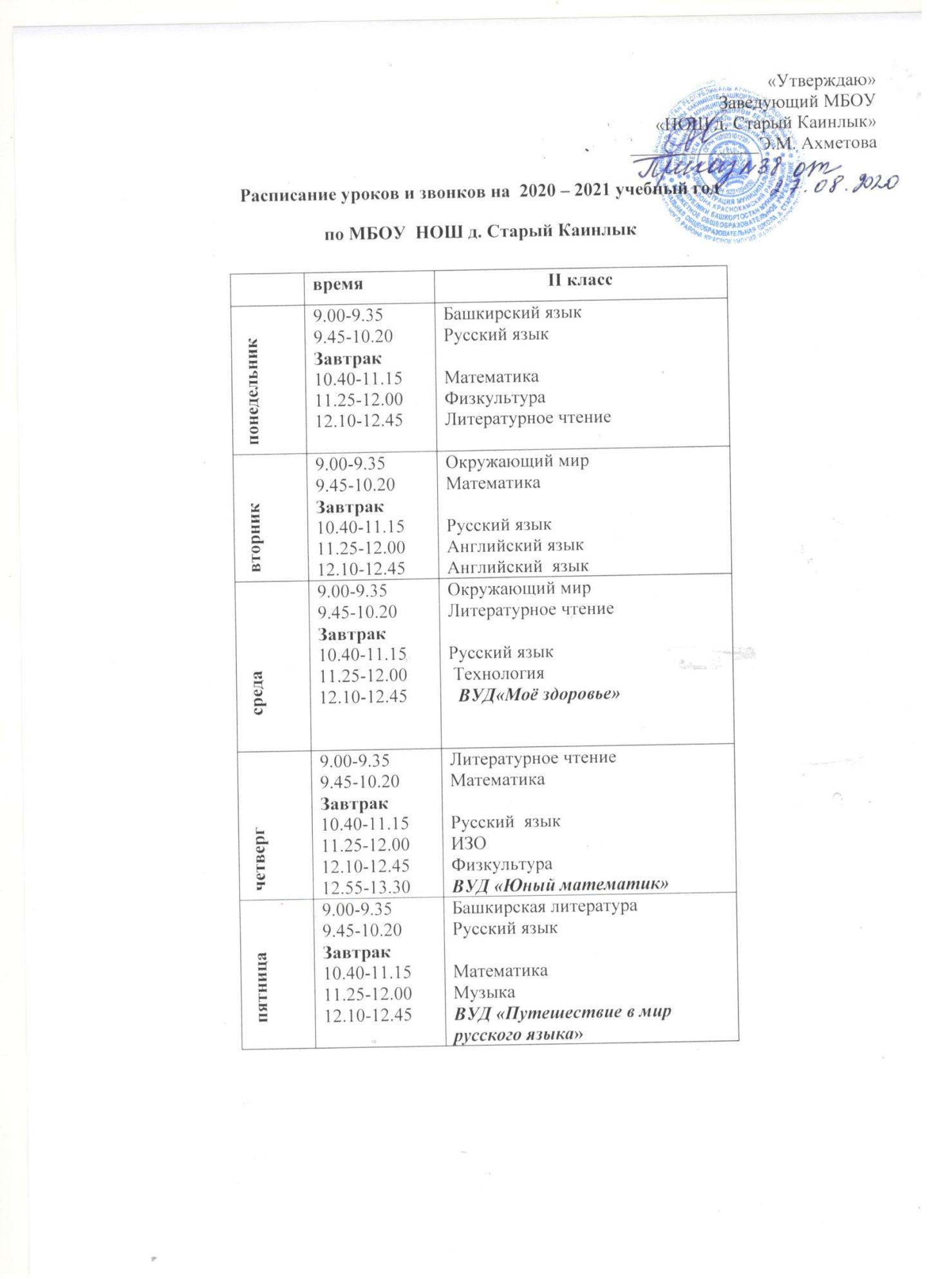 Расписание уроков и ВУД по НОШ д. Новый Татыш